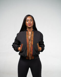 While it maintains a classic bomber silhouette, it stands out with a hint of African fabric on the exterior and is fully lined with the same vibrant print on the inside, adding a trendy flair.